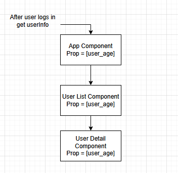 Let us consider a basic example where a user logs in and after that, we need to get the user’s details. Let us only consider “age” for now, and we need to pass this age to the UserDetail Component. Then the flow would be